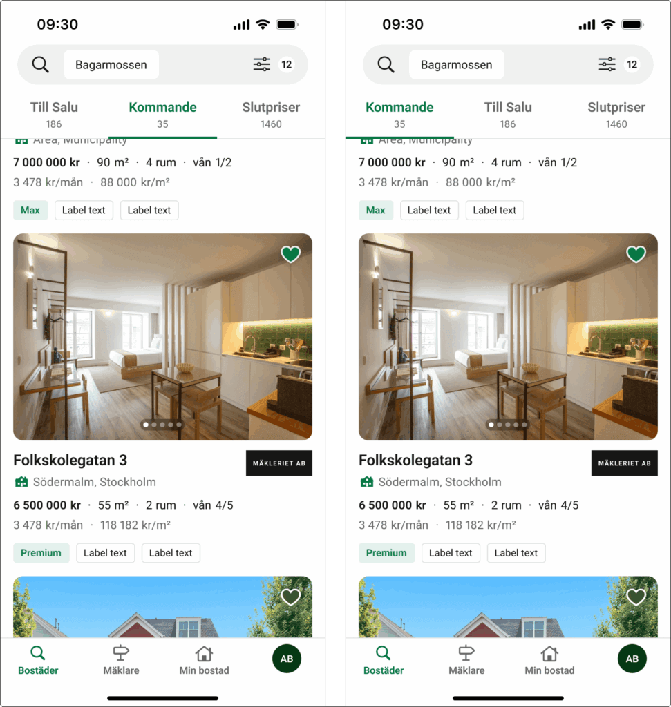 Men nu ändrar vi ordning på dem, så att kommande hamnar i besökarens blickfång. Dels representerar det bättre den kronologiska resan säljare går igenom (kommande → till salu → slutpriser). Och dels blir det enklare för alla Hemnets användare att upptäcka kommande-bostäder och öka engagemanget för kommande på Hemnet.