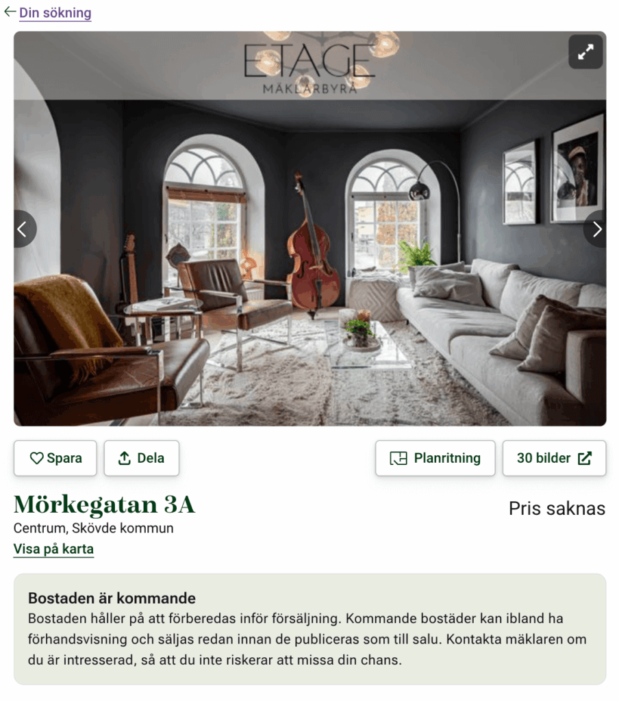 Det tror vi kommer att skapa mer engagemang runt annonsen, hjälpa köparen framåt i boenderesan och att komma närmre transaktionen, vilket innebär fler leads till dig som mäklare. Dessutom upplyser vi besökaren om spara bostaden-funktionen.