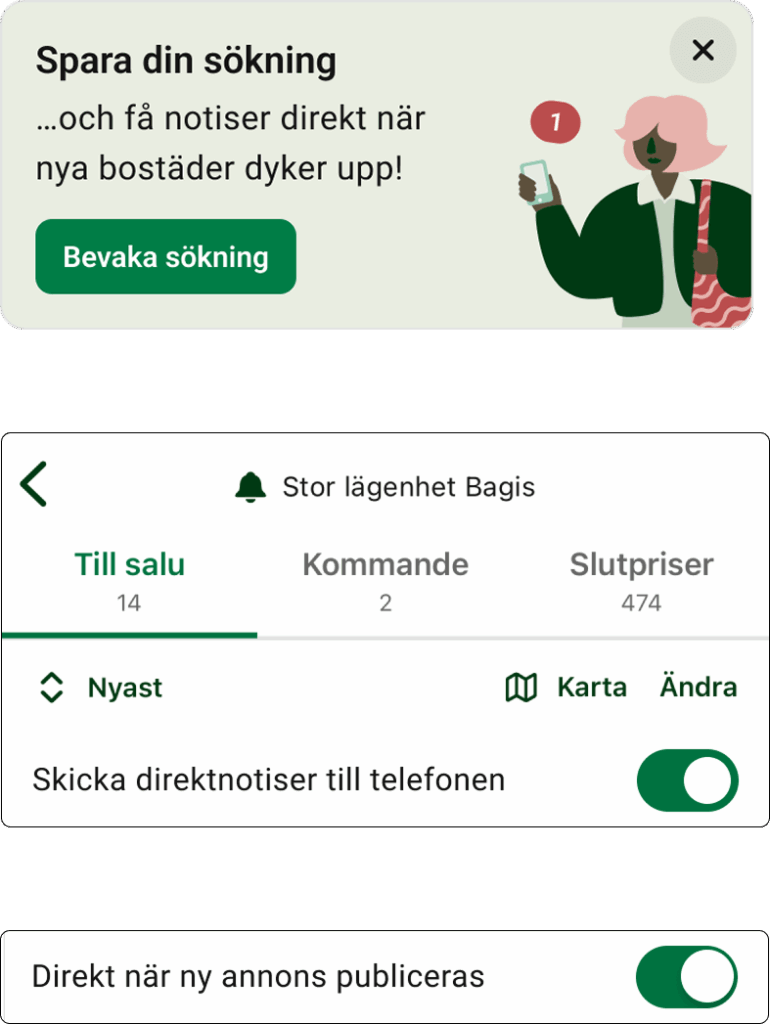 I appen har vi live-notiser, vilket gör att man som användare får push-notifikationer om kommande i realtid. Nu har vi gjort en rad mindre förändringar som ska få användare att spara sökningar och slå på livenotiser. På så sätt vill vi göra att fler upptäcker annonser som publiceras som kommande, inom deras sparade sökningar.