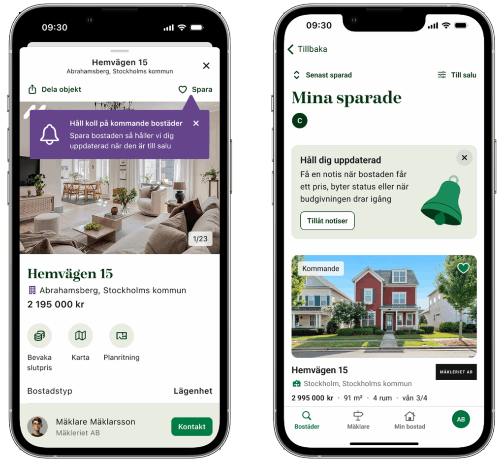 När mäklaren lägger till ett utgångspris kommer de användare som sparat annonsen därför att bli notifierade genom en pushnotis. Det hjälper mäklaren att kommunicera med heta spekulanter och säkerställer att användare får information i realtid.