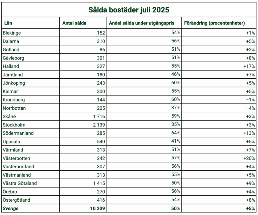 I år var dock mönstret extra tydligt, och andelen bostäder sålda under utgångspris var den högsta på en julimånad sedan mätningarna började. Detta beror dels på det höga utbudet, där fler säljare än vanligt inte lyckades sälja sina bostäder under våren, men även på den förändrade marknadssituationen, där utgångspriserna generellt sätts på högre nivåer.